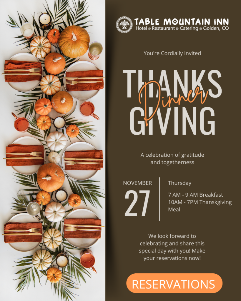 Celebrate Thanksgiving with us at Table Mountain Grill & Cantina. Enjoy festive flavors, warm hospitality, and a cozy space perfect for gathering with loved ones. Reserve your table today.