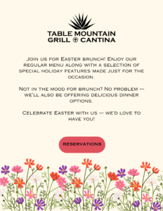 Table Mountain Grill & Cantina is located in historic Golden, Colorado. With its vibrant Santa Fe décor and fresh Southwestern cuisine, Table Mountain Grill & Cantina feels like dining in a good friend’s home. Relax over daily brunch, indulge in happy hour, or dive into a flavorful dinner with your favorite people.